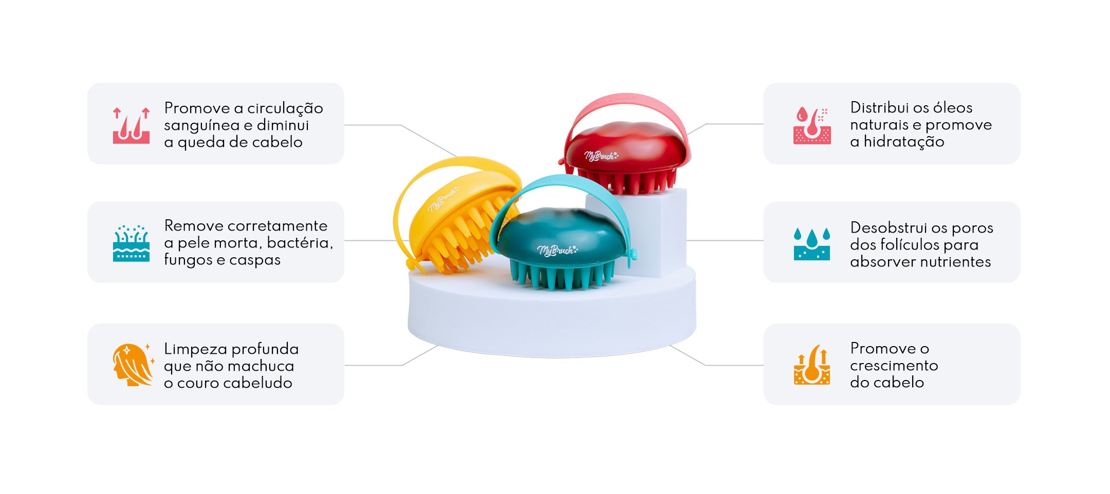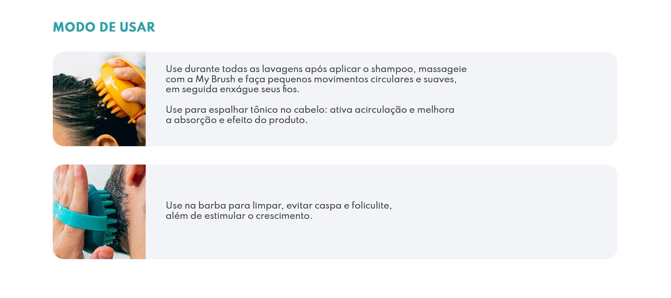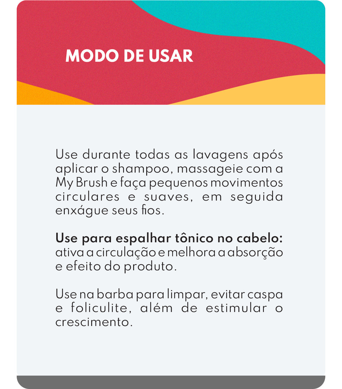 Você também pode (e deve) usar para espalhar tônico no cabelo. Se você já faz uso de algum tipo de tônico ou sérum capilar, após aplicação massageie seu couro cabeludo com a sua My Brush, ela ativa a circulação e melhora a absorção e efeito do produto.